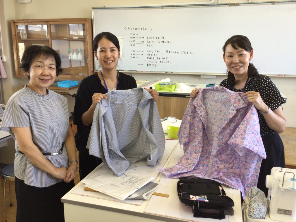 指導教諭 浅野佐江子先生(興陽高校)に指導のポイントや生徒がしがちな失敗などを御指導いただき,また各グループでも被服の指導経験豊富な先生と若手教員がともに学びあいながら製作した。シャツ1枚の製作を通して、ベテランの先生方が暗黙知を余すことなく伝えてくださったことで研修がより充実し、検定指導はもちろんのこと教科指導にもつながる大変意義深い実技講習会となった。
